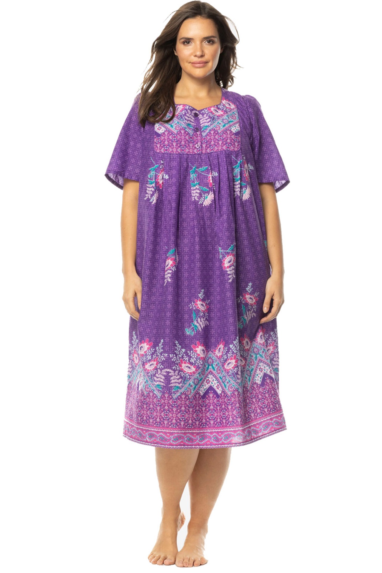 Relax in this pure cotton lounge dress with front and back pleats create a sweeping silhouette. Fuller sleeves and side pockets.